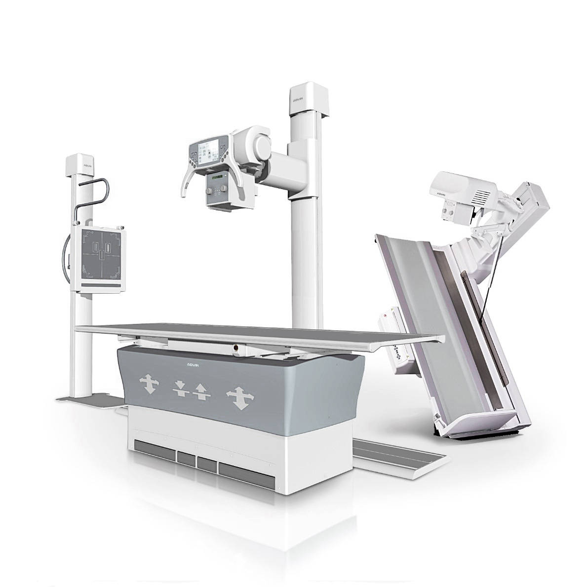 Аппарат на три рабочих места на основе моторизованного наклонного стола-штатива, стола снимков с подвижной декой и вертикальной стойки снимков. Позволяет проводить широкий спектр рентгеновских исследований костных структур и мягких тканей пациента в условиях стационара: