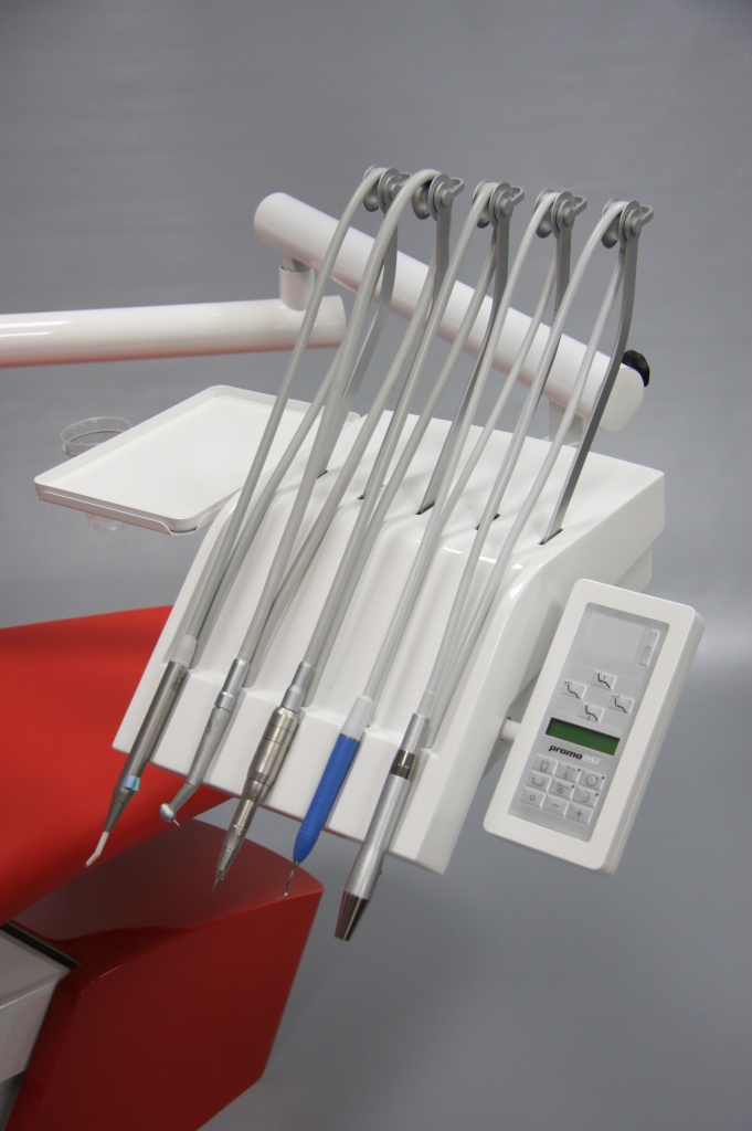 Столик врача на пять инструментов. Мембранная клавиатура на панели управления со световой индикацией. Кириллический ЖК дисплей отображает текущие состояния установки и кресла.
